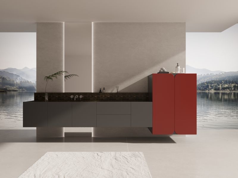 Этот туалетный столик для ванной комнаты представлен как система, ориентированная на дизайн, а не как универсальный товар. Он использует серый цвет в сочетании со структурой шкафа из нержавеющей стали для создания более целостной визуальной идентичности для премиальных жилых проектов.