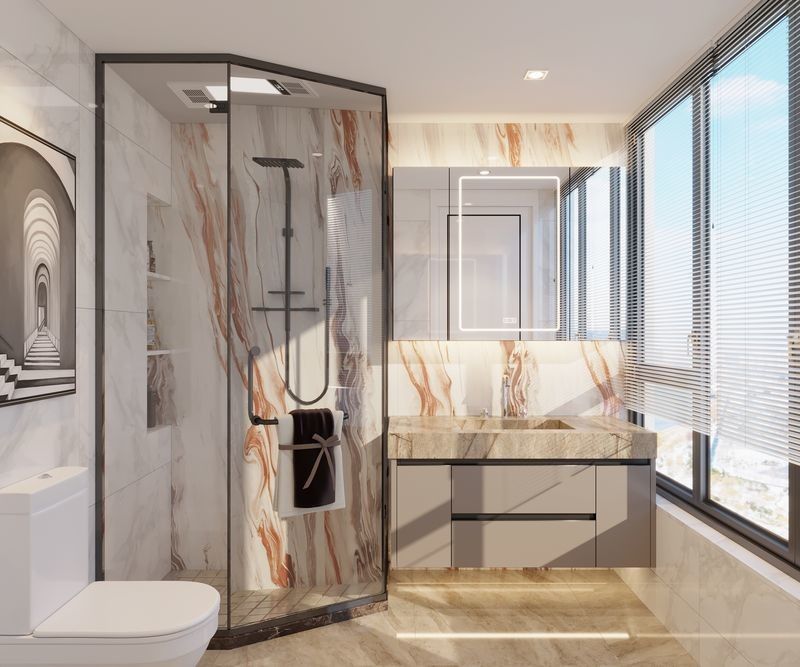 | Окружение | Ванная комната окружена роскошными мраморными стенами и полами из золотого мрамора. Потолок окрашен в белый цвет |