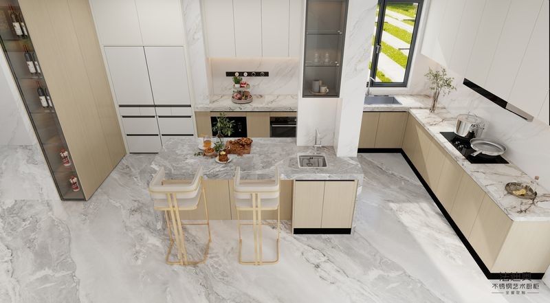 Этот кухонный гарнитур на заказ построен на основе дифференцированной стратегии отделки: текстура дерева / белый в сочетании со структурой из нержавеющей стали. Эта комбинация придает покупателям более роскошное ощущение тепла, не теряя при этом легкости очистки и долговечности, ожидаемых от гарнитура из нержавеющей стали.