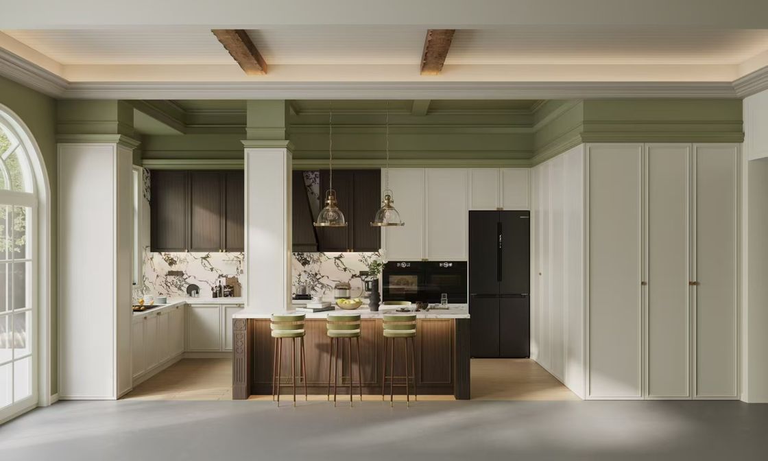 Эта кухонная коллекция Fadior переосмысливает классическую французскую эстетику через призму современного мастерства нержавеющей стали. Отличаясь поразительным контрастом панелей дверей цвета слоновой кости и глубокого черного цвета, она привносит ощущение сбалансированной драматичности в ваш интерьер. Пол из мягкой древесины и приглушенный зеленый потолок во французском стиле обеспечивают естественное тепло, прекрасно гармонируя с прочным, но элегантным каркасом из нержавеющей стали. Созданная для удовлетворения потребностей как в стиле, так и в производительности, эта кухня — не просто визуальный акцент, а высокофункциональное, долговечное рабочее пространство. Fadior сочетает изысканный дизайн с инновационным использованием материалов, переопределяя то, чего может по-настоящему достичь полная индивидуальная настройка дома из нержавеющей стали.