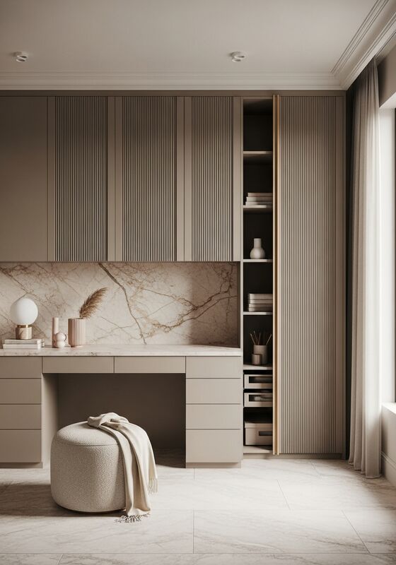 | Design HighlightsSoft feminine minimalism with architectural fluting detail, tonal warmth, zero visual clutter direction with warm mushroom taupe dominant, pale champagne accents, soft rose marble compatible surfaces, champagne gold metalwork, disciplined proportions, and vertical micro-fluted taupe lacquer doors with 15mm pitch shadow rhythm. The page should read as a resolved specification, not a generic storage box. |