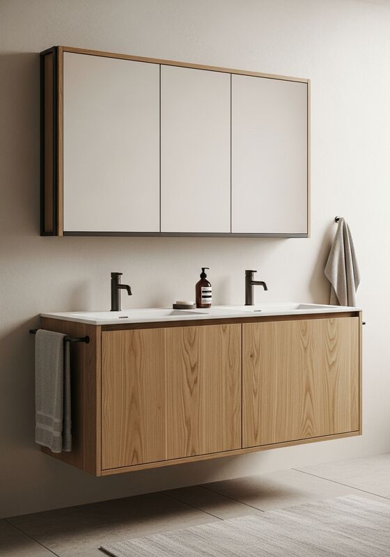 Fadior позиционирует этот шкаф-тумбу для ванной комнаты как решение для проектного использования, построенное на основе конструктивного корпуса из пищевой нержавеющей стали марки 304; натуральный шпон японского дуба (прямой рисунок, матовый, промасленный); стальные панели с порошковым покрытием теплого пергаментно-белого цвета; кованые черные железные акцентные рамы, прямой рисунок, теплый медовый оттенок, матовая промасленная поверхность, видимый, но сдержанный рисунок волокон, и столешница из полированного мрамора или спеченного камня для туалетного столика в главной ванной комнате жилых помещений, стремящихся к спокойной, ритуальной утренней обстановке; подходит для архитекторов и дизайнеров, специализирующихся на интерьерах в стиле джапанди или теплый минимализм. Эта спецификация фокусируется на основе из нержавеющей стали марки 304 с передними панелями из натурального шпона японского дуба — прямой рисунок, теплый медовый оттенок, матовое промасленное покрытие, верхнее отделение для хранения с порошковым покрытием теплого пергаментно-белого цвета с матовой поверхностью цвета яичной скорлупы — кремово-белый с легким желтоватым оттенком, чтобы дизайнеры, дилеры и покупатели проектов могли оценить соответствие, отделку и логику доставки с меньшими догадками.