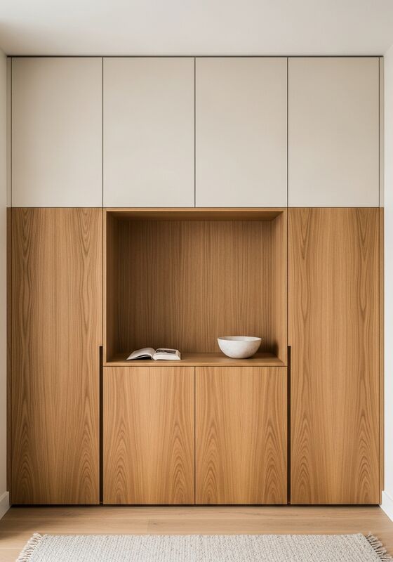 | Основные моменты дизайнаМинимализм в стиле джапанди с чувствительностью ваби-саби — теплая материальность, дисциплинированные пропорции, ручная несовершенность в рамках точного геометрического направления с натуральным дубом медового оттенка (теплый золотистый древесный якорь), теплым пергаментным белым (кремово-белый с желтым теплом), теплым глиняно-серым (тон глазури ручной работы), черным железом (тонкий темный структурный акцент), дисциплинированные пропорции и основная конструкция из нержавеющей стали марки 304 с облицовкой из натурального шпона японского дуба теплого медового оттенка. Страница должна восприниматься как готовая спецификация, а не как обычный ящик для хранения. |