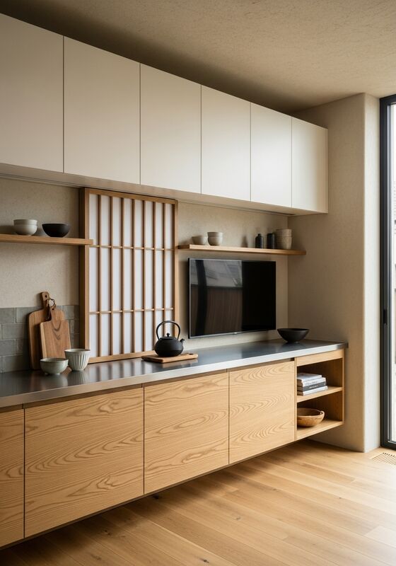 | Стиль дизайна | Сдержанный минимализм в стиле джапанди с теплотой материалов ваби-саби — доминирование прямослойного дуба, теплые кремово-белые рецессивные элементы, тонкие темные структурные акценты, интеграция мягкого рассеянного освещения |