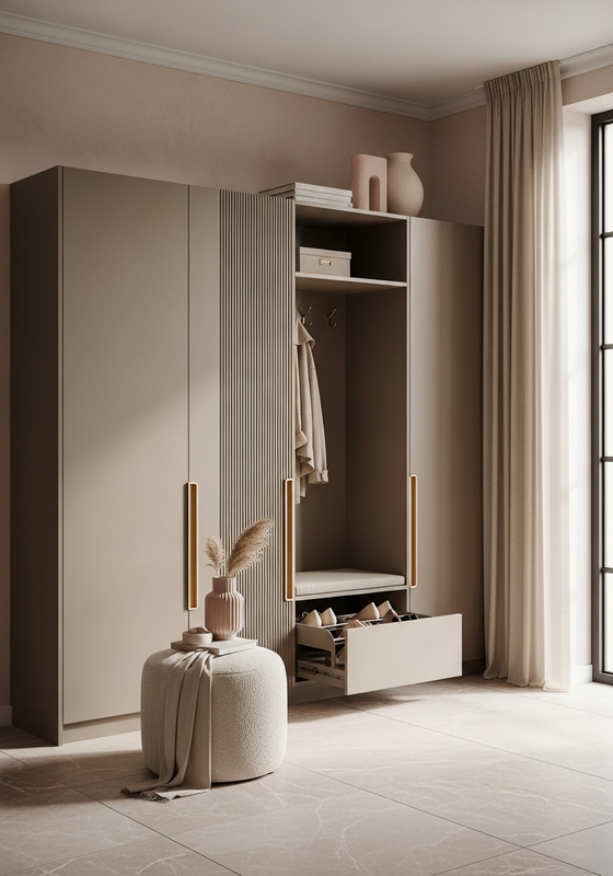 Fadior positions this shoe storage cabinet as a project-grade solution built around 304 food-grade stainless steel structure with matte taupe powder-coat lacquer finish (220°c baked), champagne gold pvd-coated stainless steel frame reveals, steel-based wardrobe panels with matte taupe lacquer finish, and a matching stone or steel surface top for primary entryway or bedroom shoe storage for 24-30 pairs; suitable for luxury residential, boutique hospitality, or designer showhome applications. This specification focuses on Vertical micro-fluted wardrobe doors at 15mm pitch in warm mushroom taupe lacquer, Champagne gold PVD-coated stainless steel frame reveals with satin 5mm accent so designers, dealers, and project buyers can evaluate fit, finish, and delivery logic with less guesswork.